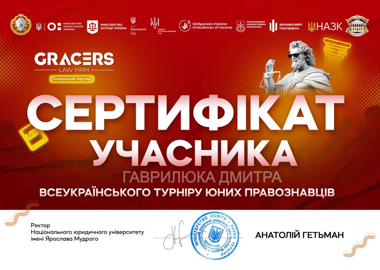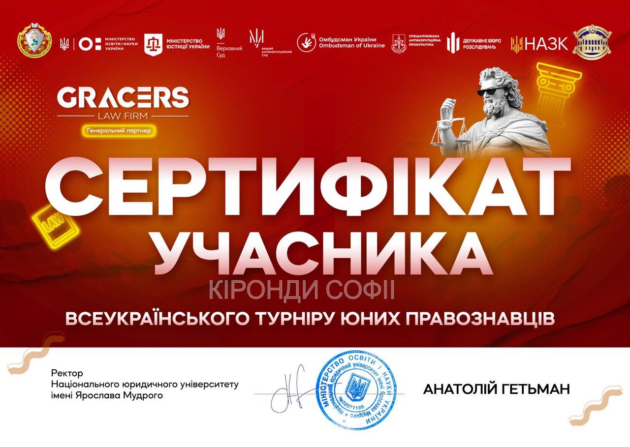 Під керівництвом наставника к.ю.н., доц. Іванни Полонки здобувачі освіти Фахового коледжу ПВНЗ «Буковинський університет» Дмитро Гаврилюк та Софія Кіронда взяли участь у Всеукраїнському турнірі юних правознавців і отримали сертифікати учасників.