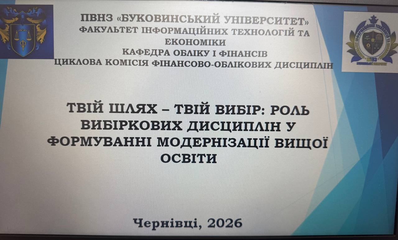 Протягом квітня 2026 року в ПВНЗ «Буковинському університеті» та Фаховому коледжі проведено презентації вибіркових освітніх компонентів для здобувачів освіти освітньо-професійних програм «Фінанси, банківська справа, страхування та фондовий ринок», які передбачені для вивчення у 2026-2027 навчальному році.